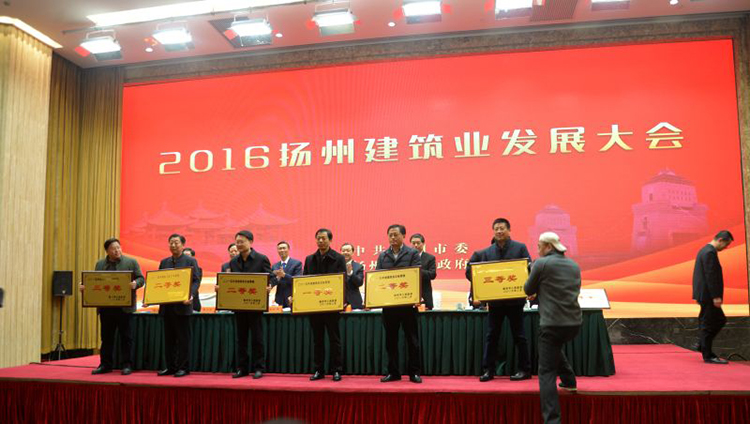 會議由聞道才副市長主持,與會人員首先觀看了“十二五”揚州建筑業(yè)發(fā)展專題片,聽取了朱民陽市長所做的工作報告。然后市政府對2015年全市建筑業(yè)目標(biāo)管理獎獲獎單位和全市建筑業(yè)先進企業(yè)、先進個人進行了表彰。建工控股公司獲得唯一的2015年市政府建筑業(yè)目標(biāo)管理一等獎,位列各縣(市)區(qū)之上,市委書記謝正義親自向陸金龍董事長頒獎。2015年全市僅有的兩項魯班獎工程均由江蘇華建創(chuàng)造,宗有農(nóng)總經(jīng)理、吳士茂主席上臺領(lǐng)獎。此外,江蘇華建還有4名員工分別被市政府表彰為優(yōu)秀建造師、優(yōu)秀班組長。