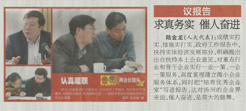 元月7日的《揚州日報》焦點新聞欄目報道了我公司董事長陸金龍參加揚州市七屆人大二次會議的有關情況。本次人代會6日上午在揚州會議中心隆重開幕,作為市人大代表,陸董事長在會上認真參與對朱民陽市長代表政府所作工作報告的討論,并圍繞“六個基本”抓發展、合力推進“三個揚州”和世界名城建設、加快建設更高水平小康社會積極建言獻策。《揚州日報》在人大代表“議報告”中第一個刊登了陸董事長的發言:“成績實打實、措施實打實。政府工作報告中,扶持實體經濟發展部分,明確提出出臺扶持本土企業意見,對重點行業和骨干企業實行一業一策、一企一策服務,高度重視建立微小企業服務體系,同時把‘培育優秀企業家’寫進報告,這對揚州的企業界來說,催人奮進,是莫大的鼓舞。”
