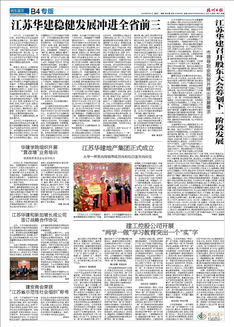 今日《揚州日報》刊登專版文章報道華建進入全省前三有關消息 時間:2016-06-14 4110 今天出版的《揚州日報》B4“揚州建工”專版刊登了江蘇華建穩健發展沖進全省前三、華建股東大會、華建地產集團成立、“兩學一做”學習教育等相關文章,歡迎關注。